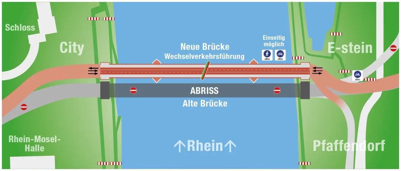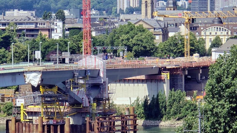 Aufgrund der Untersuchungen wurde am 1. Oktober 2008 die von Norden zur Pfaffendorfer Brücke führende Rampe wegen akuter Einsturzgefahr für den Verkehr gesperrt. Dieser Bereich konnte am 27. November 2009 wieder freigegeben werden, nachdem die Schäden provisorisch repariert worden waren.