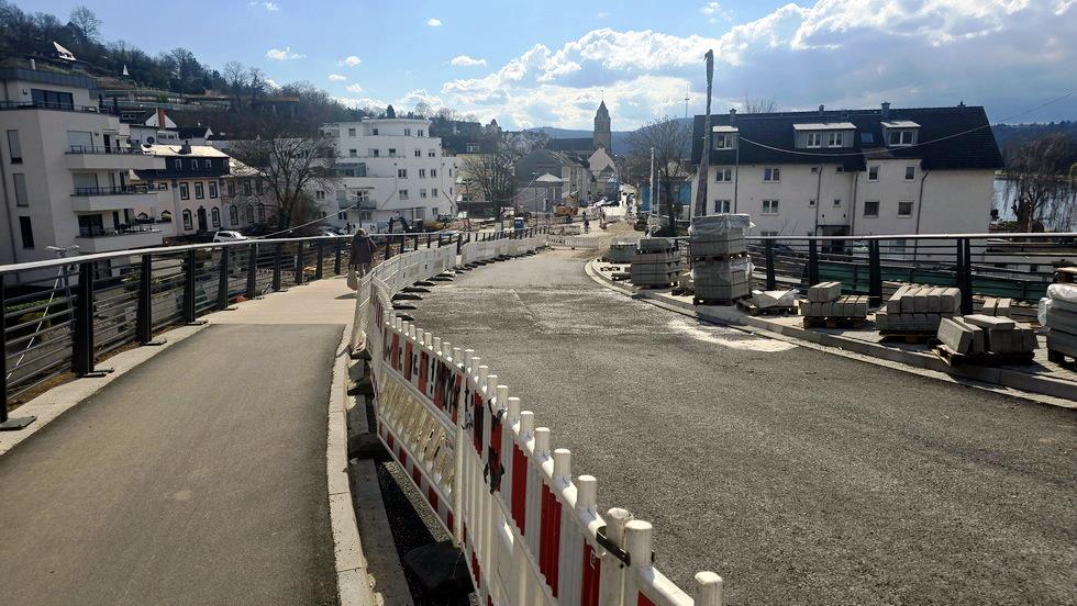 Nach dem Abriss der alten Brücke wird die neue Brücke auf den Platz der alten Brücke verschoben. Hierfür gilt dann eine sechswöchige Vollsperrung. Zudem werden die Zufahrten wieder umgelegt. Die Hilfspfeiler können danach abgebaut werden.