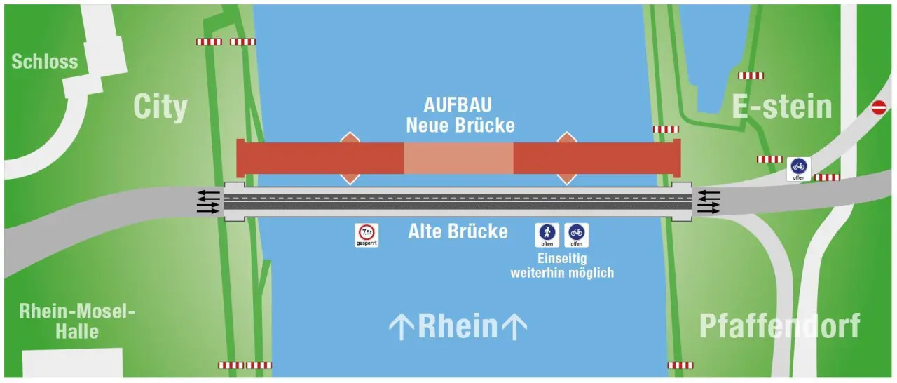 Die vier Karten entstammen der Broschüre der Stadt Koblenz. Sie können den Bauverlauf auf dieser Site der Stadt Koblenz verfolgen.