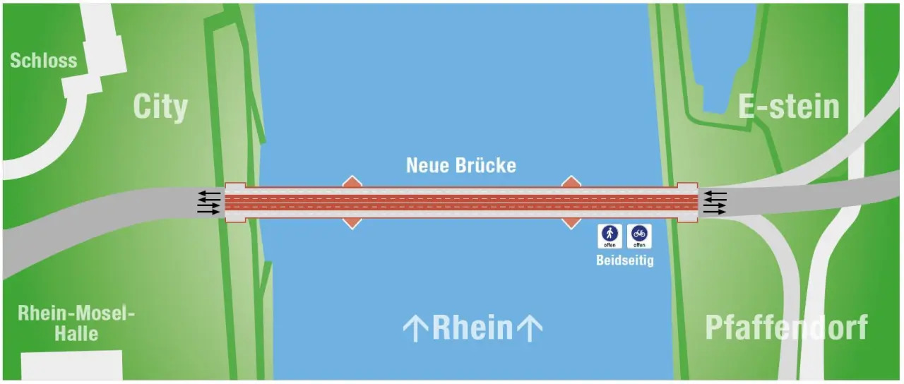 Mit einer Gesamtbreite von 5,20 Meter werden die neuen beidseitigen Geh- und Radwege der Brücke rund einen Meter breiter sein als die bisherigen. Zusätzliche Schutzstreifen sollen für eine bessere Orientierung und Verkehrssicherheit auf der Brücke sorgen und den Rad- und Gehwegbereich voneinander trennen.