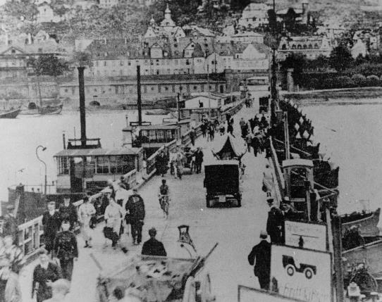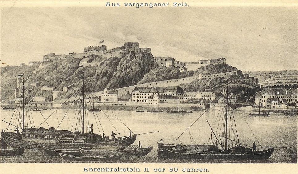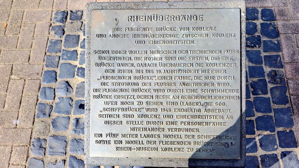 Schon immer wollen Menschen den trennenden Fluss überwinden. Die Römer sind die ersten, die eine Brücke bauen. Danach überqueren die Koblenzer den Rhein bis ins 19. Jahrhundert mit einer „Fliegenden Brücke“, einer Fähre, die nur durch die Strömung des Flusses angetrieben wird. Die „Fliegende Brücke“ wird durch eine schwimmende Brücke ersetzt, deren Reste am gegenüberliegenden Ufer noch zu sehen sind (Lager). Die sog. „Schiffsbrücke“ wird 1946 endgültig abgebaut. Seitdem sind Koblenz und Ehrenbreitstein an dieser Stelle durch eine Personenfähre miteinander verbunden.