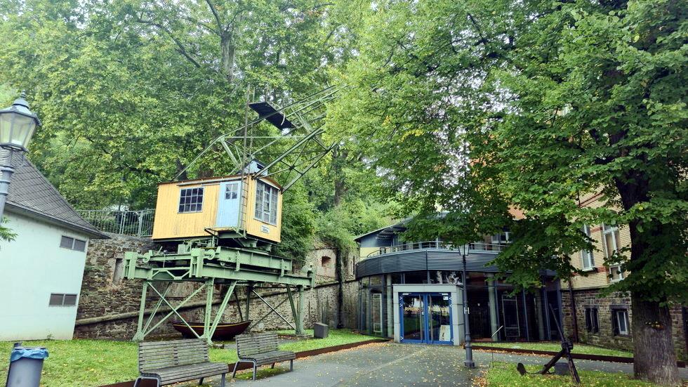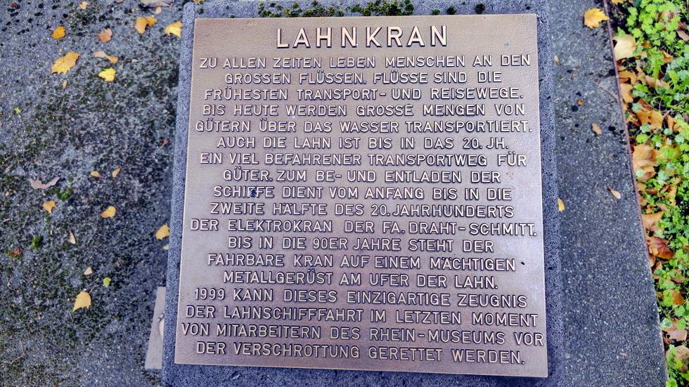 Zu allen Zeiten leben Menschen an den großen Flüssen. Flüsse sind die frühesten Transport- und Reisewege. Bis heute werden große Mengen von Gütern über das Wasser transportiert. Auch die Lahn ist bis in das 20. Jahrhundert ein viel befahrener Transportweg für Güter. Zum Be- und Entladen der Schiffe dient vom Anfang bis in die zweite Hälfte des 20. Jahrhunderts der Elektrokran der Fa. Draht-Schmitt. Bis in die 90er Jahre steht der fahrbare Kran auf einem mächtigen Metallgerüst am Ufer der Lahn. 1999 kann dieses einzigartige Zeugnis der Lahnschifffahrt im letzten Moment von Mitarbeitern des Rhein-Museums vor der Verschrottung gerettet werden.