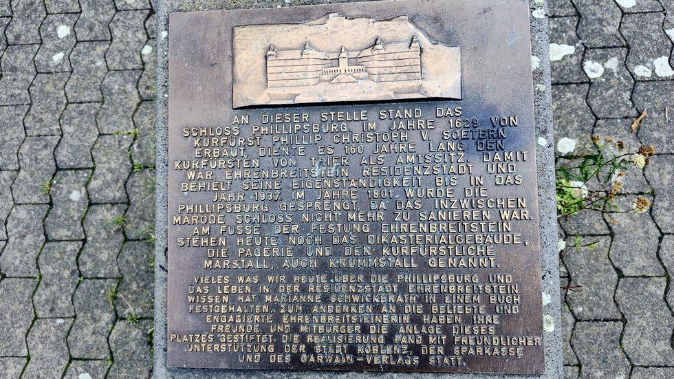 An dieser Stelle stand das Schloss Phillipsburg. Im Jahre 1628 von Kurfürst Phillip Christoph von Soetern erbaut, diente es 160 Jahre lang den Kurfürsten von Trier als Amtssitz. Damit war Ehrenbreitstein Residenzstadt und behielt seine Eigenständigkeit bis in das Jahr 1937. Im Jahre 1801 wurde die Phillipsburg gesprengt, da das inzwischen marode Schloss nicht mehr zu sanieren war. Am Fuße der Festung Ehrenbreitstein stehen heute noch das Dikasterialgebäude, die Pagerie und der kurfürstliche Marstall, auch Krummstall genannt.