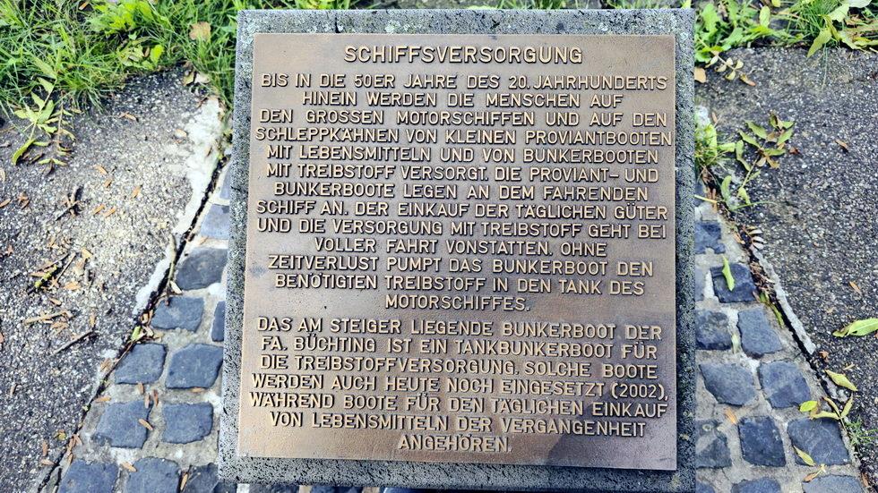 Das am Steiger liegende Bunkerboot der Fa. Büchting ist ein Tankbunkerboot für die Treibstoffversorgung. Solche Boote werden auch heute noch eingesetzt (2002), während Boote für den täglichen Einkauf von Lebensmitteln der Vergangenheit angehören.