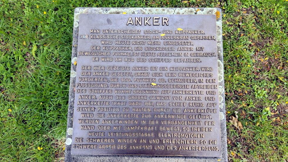 Der hier gezeigte Anker ist ein Klippanker. Wird der Anker gesetzt, gräbt sich sein bewegliches Vorderteil, die sog. Flunken od. Schaufeln, in den Flussgrund. Durch das strömungsbedingte Abtreiben des Schiffes kommt Spannung auf Ankerkette und Anker. Auch das große Gewicht von Anker und Ankerkette trägt dazu bei, das Schiff ruhig auf seiner Position zu halten. Durch die Ankerklüse wird die Ankerkette zur Ankerwinde geführt- Werden Ankerwinden in der Vergangenheit per Hand oder mit Dampfkraft bewegt, so treiben heute leistungsstarke Elektromotoren die schweren Winden an und erleichtern so die schwere Arbeit des Ankerns und der Ankerbergung.