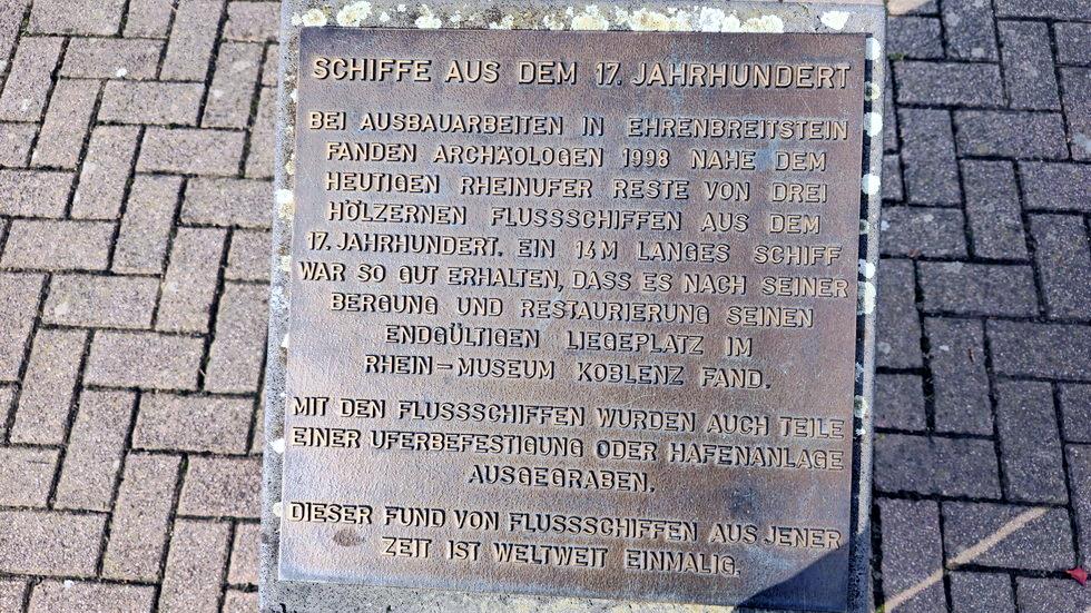 Bei Ausbauarbeiten in Ehrenbreitstein fanden Archäologen 1998 nahe dem heutigen Rheinufer Reste von drei hölzernen Flussschiffen aus dem 17. Jahrhundert. Ein 14 m langes Schiff war so gut erhalten, dass es nach seiner Bergung und Restaurierung seinen endgültigen Liegeplatz im Rhein-Museum Koblenz fand.