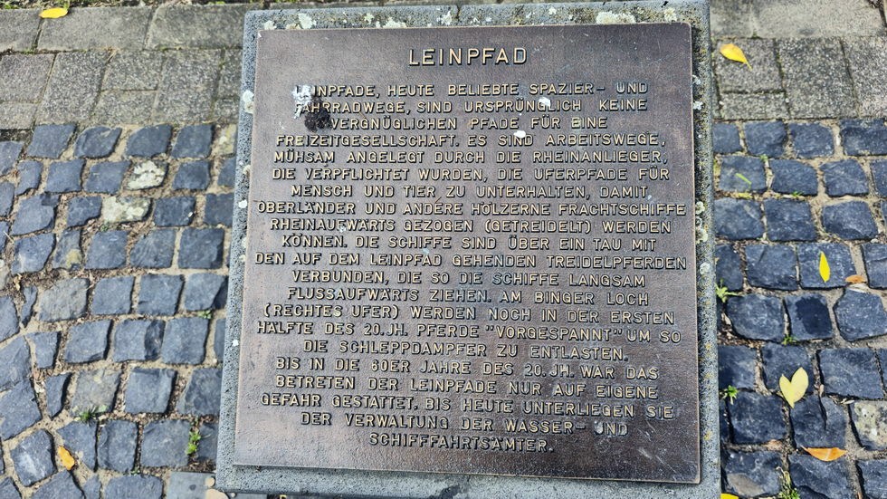 Leinpfade, heute beliebte Spazier- und Fahrradwege, sind ursprünglich keine vergnüglichen Pfade für eine Freizeitbeschäftigung. Es sind Arbeitswege, mühsam angelegt durch Rheinanlieger, die verpflichtet wurden, die Uferpfade für Mensch und Tier zu unterhalten, damit Oberländer und andere hölzerne Frachtschiffe rheinaufwärts gezogen (getreidelt) werden können. Die Schiffe sind über ein Tau mit den auf dem Leinpfad gehenden Treidelpferden verbunden, die so die Schiffe langsam flussaufwärts ziehen. Am Binger Loch (rechtes Ufer) werden noch in der ersten Hälfte des 20. Jh. Pferde „vorgespannt“, um so die Schleppdampfer zu entlasten.