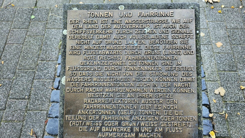 Der Rhein ist eine Wasserstraße. Wie auf dem Land der Autoverkehr, ist auch der Schiffsverkehr durch Zeichen und Signale geregelt. Damit auch vollbeladene Schiffe nicht auf Grund laufen, benötigen sie eine Mindestfahrwassertiefe. Diese Fahrrinne wird flussabwärts durch grüne (links) und rote (rechts) Fahrrinnentonnen gekennzeichnet. Die Tonnen sind im Flussgrund durch Tonnenanker befestigt, so dass sie nicht von der Strömung des Wassers weggetragen werden können.