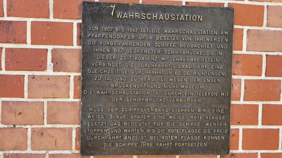 Von 1907 bis 1947 ist die Wahrschaustation am Pfaffendorfer Ufer besetzt. Von ihr werden die vorbeifahrenden Schiffe beobachtet und ihnen bei geöffneter Schiffsbrücke, die in dieser Zeit Koblenz mit Ehrenbreitstein verbindet, die Durchfahrt signalisiert. Eine gleichzeitige Durchfahrt, in beide Richtungen, zu Tal und zu Berg, ist wegen der engen Brückenöffnung nicht möglich.