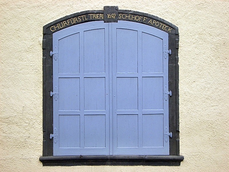 Im Hinterhof zur Meesgasse steht noch ein zweistöckiges Gebäude mit einer großen, nach oben abgerundete Basaltfenstereinfassung, welche die Inschrift „Curfürstl. Trierisch Hoffapoteck 1692″ trägt. Dieses Fenster war wohl früher das Ladenfenster der Apotheke.
